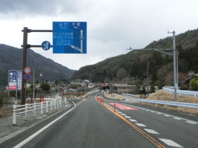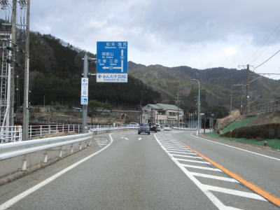 | 大きく右にカーブして南木曽大橋でダム湖を渡って左岸に移る。支流の蘭川に架かる吾妻橋を渡った先でR256妻籠宿入口交差点を通過する。この交差点がR256が分岐する。弥栄橋交差点からの距離は約7.3kmである。 | ||