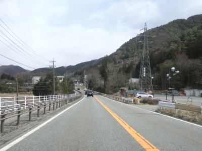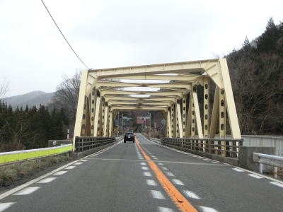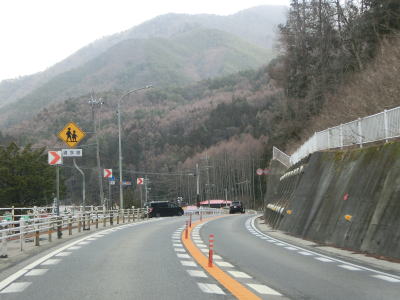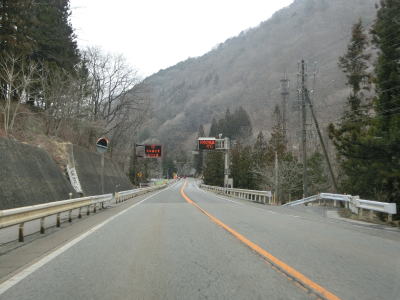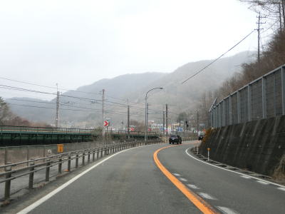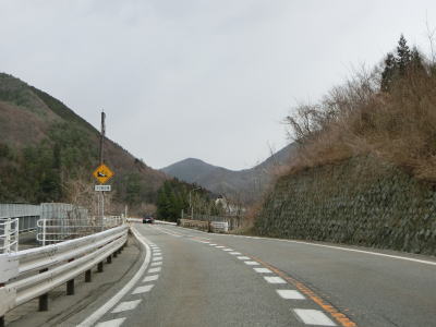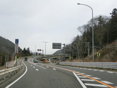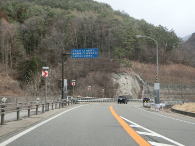 | 右にカーブしてJR中央本線から離れた直後に吉田橋を渡って木曽川の左岸に移る。菅集落を通り抜けた後に吉田洞門をくぐって右カーブを曲がって鷲鳥橋を渡る。鷲鳥橋から北は異常気象時通行規制区間で1.1kmの区間内において連続雨量170mmを超えると通行止になる。 | ||