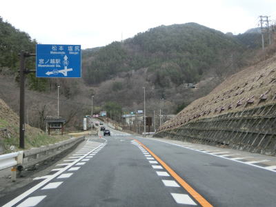 | 道の駅を過ぎてすぐに長野r257平沢北交差点を通過し、奈良井川の右岸を走っているとJR中央本線の橋梁の下をくぐった直後に桃岡橋を渡って左岸に移る。センターライン上にラバーポールが設置された右カーブを曲がるとラバーポールから中央分離帯に替わる。法面の状況から察するに改良された際に設置されたものと思われる。中央分離帯がなくなって2車線道路に戻ってからは中央本線の西側を走って贄川駅の傍を通る。 | ||