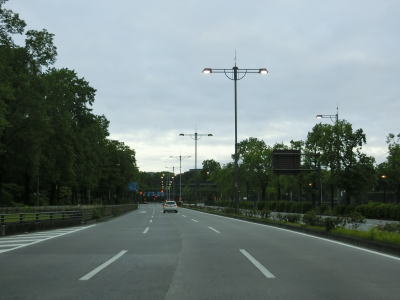 | 右折車線が設置された交差点を除いて左側車線はそれほど狭くなくなったものの道路側にせり出している街路樹があるので気を遣わなければならない。東京r117給田交差点を過ぎて少し走ると調布市に入り、仙川大橋を渡った先で旧道との仙川三差路交差点と東京r114交差点、r114仙川駅入口交差点を次々に通過して行く。調布市に入ってからは沿道線の騒音防止のためトラックは右側車線を走るように指定されている。 | ||