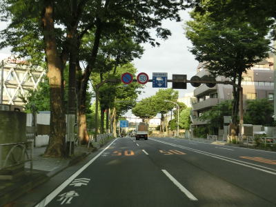 | 新宿御苑トンネルで新宿御苑の敷地の下を通り、トンネルを東京r305交差点からの側道が合流した直後に東京r305新宿4交差点を通過する。側道が左折専用車線になるため、合流部と交差点の間の短い距離で車両が交錯する事になる。 新宿4交差点を過ぎると車線が増えて片側3車線道路になる。新宿跨線橋を上っているとバスタ新宿の入口を通過するが、バスタへは路線バスとタクシーのみが進入可能で一般車両は進入禁止である。新宿跨線橋の勾配を下った先で東京r414西新宿1交差点を通過する。 |
