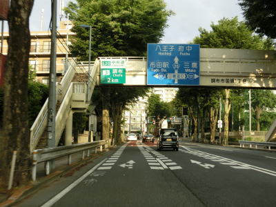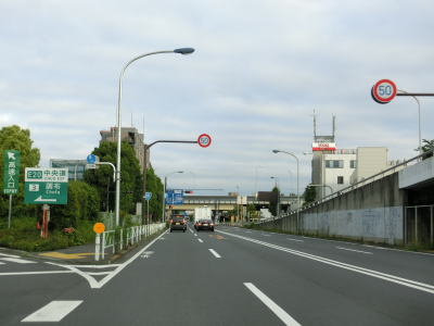 | 下石原交差点のすぐ先で東京r229富士見町交差点を道なりに右へカーブして通過し、300m先でE20中央道の調布ICを通過する。E20中央道は首都高4号新宿線に直結しているが、高井戸ICは八王子方面からの出口のみのため、実質的にこの調布ICが中央道の最初のインターチェンジと言えなくもない。E20中央道の本線の調布第2橋の下で東京r123上石原交差点を通過した後に味の素スタジアムの傍を通る。調布IC付近からは左側車線も普通の幅になるため走りやすく感じる。 | ||