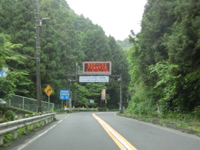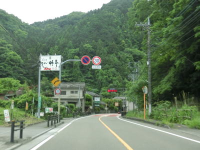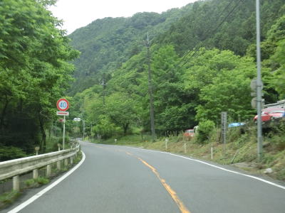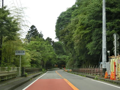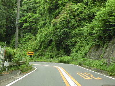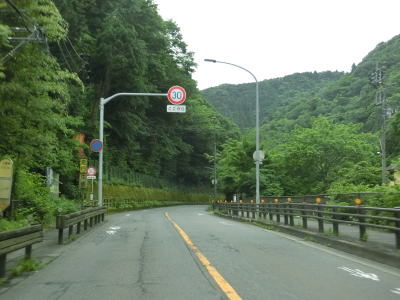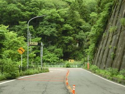 | 沿線の集落が途切れ神子橋の手前で雨量通行規制区間の起点を通過する。ここから都県境の大垂水峠を含む4.8kmが規制対象区間である。雨量通行規制区間に入ってからも案内川の谷筋が続いており、何ヶ所かで橋を渡る。緩やかな左カーブを曲がると大垂水峠を越えて神奈川県相模原市に入る。大垂水峠の標高は392mである。 | ||