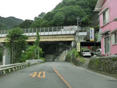 | 右カーブを曲がると周辺の家屋が少なくなる。JR中央本線のトンネルの上を通った直後にE20中央道の与瀬第一橋の下を2回くぐる。勾配は緩やかなものの急カーブが連続している2車線道路を走っていると橋沢隧道をくぐる。 | ||
