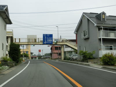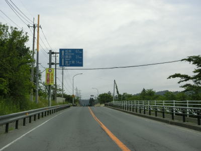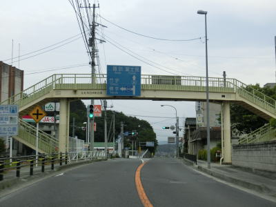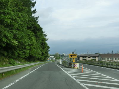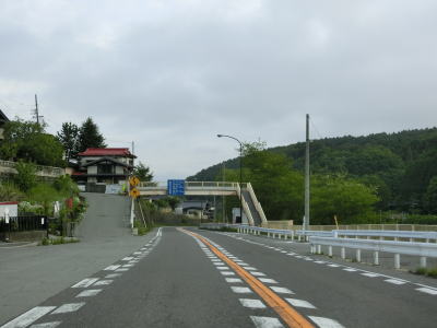 | 新流川橋の手前に470m先の歩道橋に4.5mの制限高がある事を警告する標識が取り付けられているが、歩道橋そのものが撤去されたため現在は高さの制限はなくなっている。標識が残っている事から撤去されたのはつい最近かと思いきや、2020年1月14日から15日かけてのようなので既に3年が経過している。 河岸段丘の上の段を通っているため釜無川のある東側が開けており眺望が良い。8%勾配を下った後に7%勾配を上る。数字ではかなりの急勾配だが、実際に走るとそこまで急な勾配には思えなかった。 |