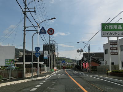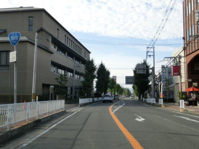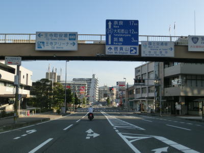 | 竜田大橋交差点快走からも二桁国道としては貧相な対面2車線道路が続いている。交通量は多く、沿線には建物が密集しており歩道がない事もあって走りにくさを感じる。路斑鳩町役場の前を通過した後に奈良r146法隆寺前交差点を通過する。交差点の名称が示す通り、r146を北上すれば法隆寺に行く事ができる。その後は奈良r5交差点、奈良r109中宮寺前交差点、奈良r9中宮寺東交差点を相次いで通過しながら北東の方角に向かって走る。 | ||