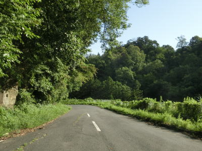 | 奈良r263交差点を過ぎると下り勾配になり、2ヶ所の右急カーブを曲がった後にR25名阪国道の本線の下を通過する。以降は遅瀬川沿いの集落のない2車線道路を走るが、路肩には雑草が生い茂っており旧道めいた雰囲気を醸し出している。 | ||
