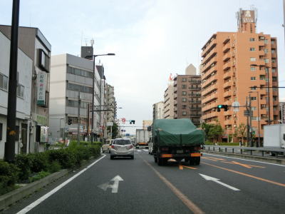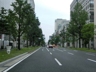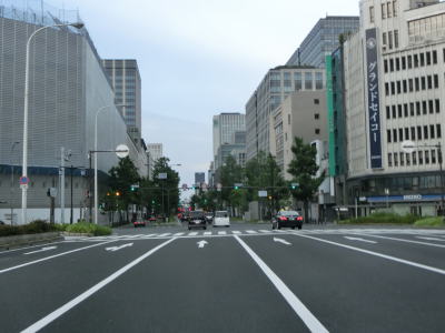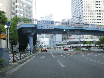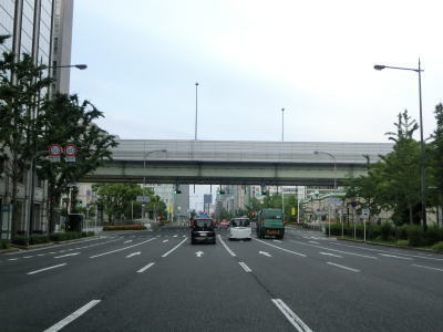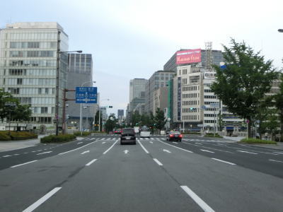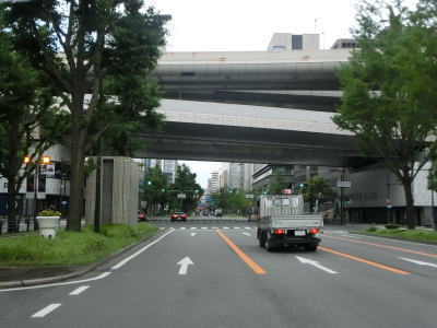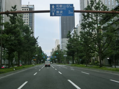 | 淀屋橋交差点からは本線4車線と側道が左右に各1車線の合計6車線となる。本線と側道の間の分離帯にはイチョウが植えられており秋には色付いた様子を目にすることができる。大阪市の中心部らしく高層ビルが立ち並んでおり、早朝にもかかわらず交通量は多い。昼間ともなれば側道には多くの路上駐車車両が見られる。 梅田新道交差点から約1.6kmでR25・R165・R172本町3交差点を通過する。R172はこの交差点が終点で、大阪港を結ぶ港国道のひとつである。本町3交差点を過ぎてすぐに船場中央3交差点を通過するが、その上に阪神高速13号東大阪線が横切っている。 |