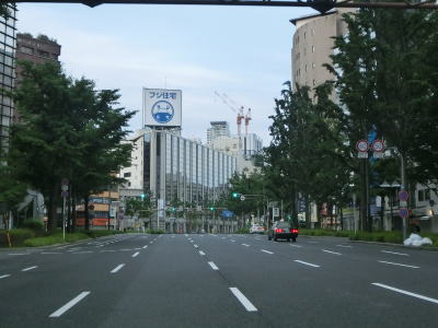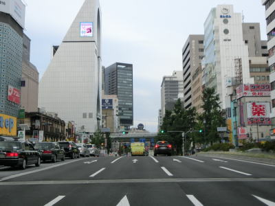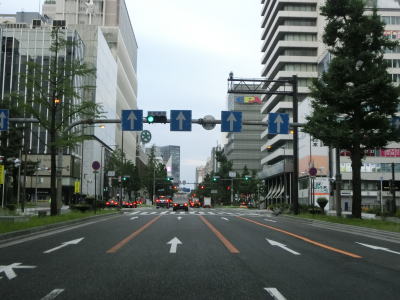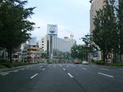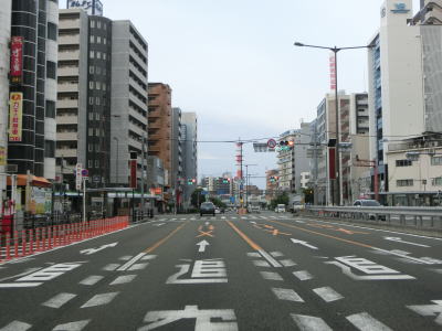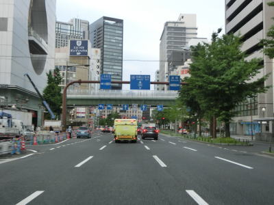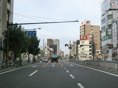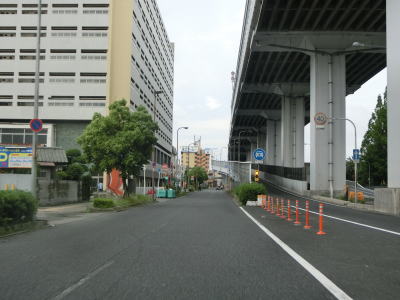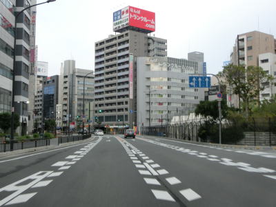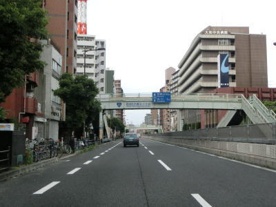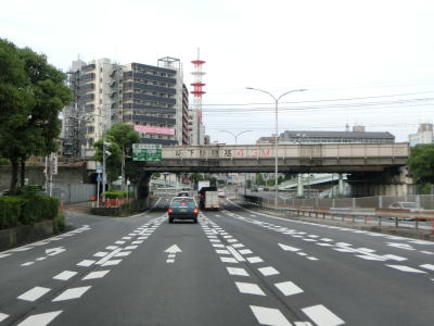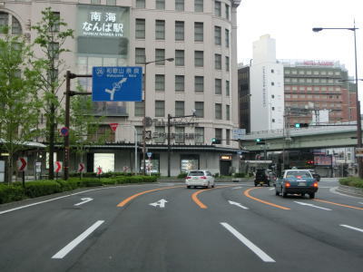 | 本線4車線+右側側道1車線の道路を走っていると阪神高速15号堺線の下の難波交差点で左端車線が左折専用車線になる。これは左側の側道がなくなる以前から変わらないが、さらに左側に短い左折車線が付加されている。難波交差点からは側道がなくなる代わりに本線が5車線になるものの難波西口交差点で左端車線が左折専用車線になってしまう。その難波西口交差点を右にカーブしながら通過すると阪神高速L1環状線をくぐる。阪神高速付近に区境があり以降は浪速区内を走る。 難波西口交差点からは本線4車線+左右の側道1車線となるが、本線の右端車線と右側側道は元町2交差点の右折車線となってしまう。元町2交差点は道なりに左にカーブしながら通過する。R26(R25とR165も)が南向き一方通行なのはこの交差点までである。元町2交差点から北に延びる四ツ橋筋が北向き車線だが、このルートは国道には指定されておらずR25とR26、R165を車両でトレースする場合は梅田新道交差点から走り始めるしかない。 |