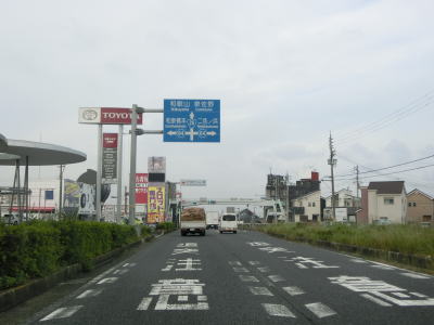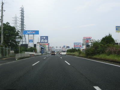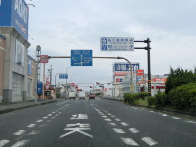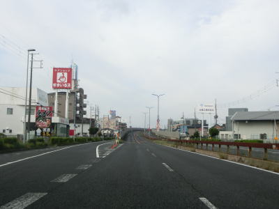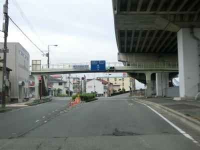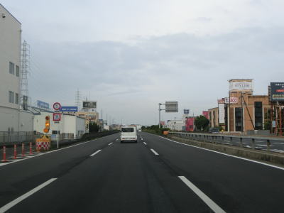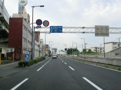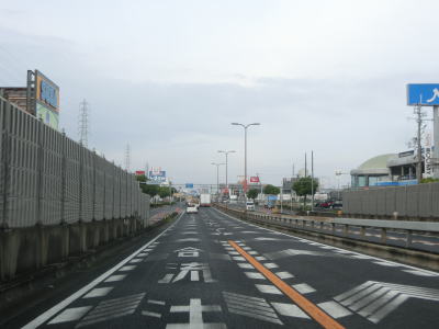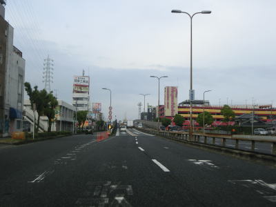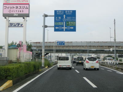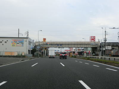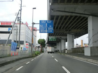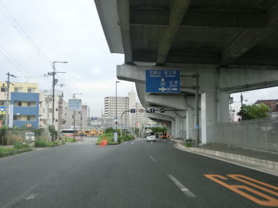 | 南海本線の岸和田駅に延びている市道との岸和田警察署東交差点を過ぎると大阪府立和泉高校東交差点を越える岸和田高架橋を通るが、この高架橋の上も片側2車線で歩行者・軽車両・原付は通行禁止である。高架橋が終わって平面道路になっても車線は増えず片側2車線のままである。市境を越えて貝塚市に入って少し走ると津田川を渡る。沿線の建物は若干減っているが、郊外型の商業施設が多く休日は混雑しそうな雰囲気である。 | ||