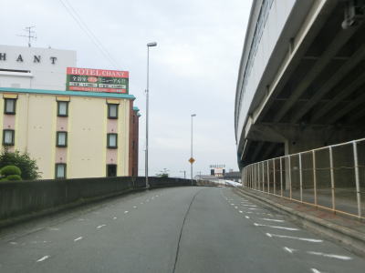 | 52.泉大津高架橋から平面道路に戻る | 53.本線は歩行者と軽車両は通行禁止 | 54.忠岡町に入る |