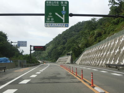| 和歌山岬トンネルを出てすぐに市道に接続している平井ランプを通過する。ランプから市道に進んで西に向かうとR26の旧道の和歌山r752に至る。平井ランプを過ぎると前方に和歌山市の市街地が見えてくる。左カーブを曲がった後に和歌山r7との大谷ランプを通過する。自動車専用道路区間はこの大谷ランプまでであるが、これより南も歩行者と自転車は通行禁止である。 | ||