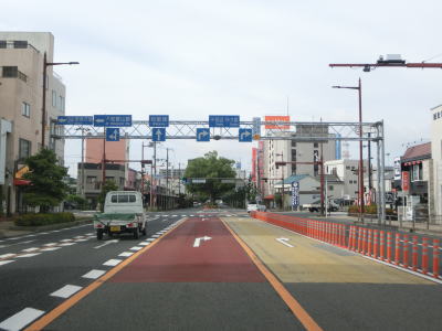 | JR紀勢本線の高架をくぐってすぐに嘉家作交差点からの側道が合流するが、合流箇所に設置された信号機により合流の流れが制御されている。側道が合流してからはR24重複区間である。R24が合流した直後の北新橋西詰交差点を右折する。右折車線は2本付加されているが、直進車線も2本あり南に延びる市道も片側2車線である。 | ||