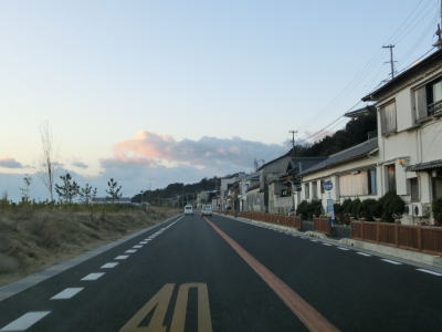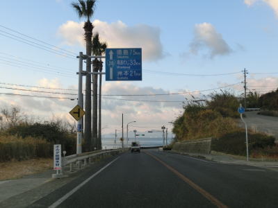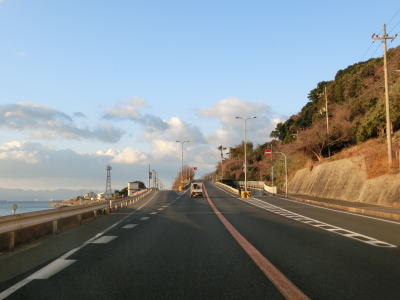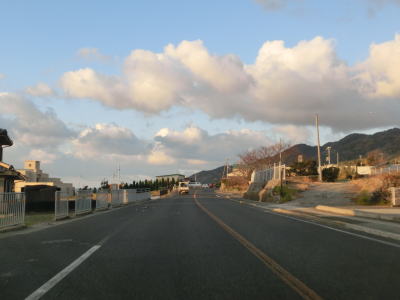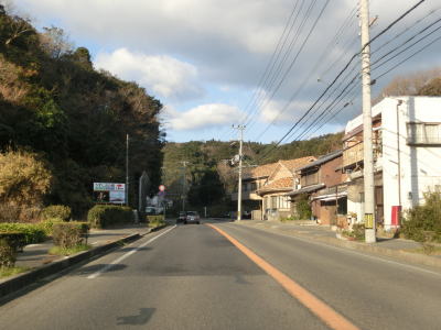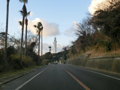 | 久留麻交差点からも比較的家屋が多く建っている間を走っているが、進むにつれてその数は減っていく。仮屋漁港付近からはアップダウンしているが勾配は非常に緩やかなので車であればさほど気にならないだろう。沿線に家屋が少なくなった辺りで正面に直立した像が見えてくる。世界平和大観音像と名だが、宗教施設と言うより博物館のような観光施設だったようである。2006年に閉館となりその後は廃墟化しているが、2014年発行のスーパーマップルにまだ記載されている。その大観音像の近くで前方に海が見えてくる。海の向こうに陸地が見えるが、これは徳島県ではなく洲本市だろう。 | ||