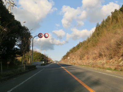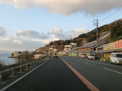 | 大観音像付近からは途切れていた集落が復活するが、その密度は低い。海のすぐ傍を走っている箇所もあり、海寄りには別荘と思われる建物もいくつか見られる。小井集落からは再び海岸線に沿って走っている。反対側の北向き車線には1ヶ所だけ短い譲り車線が設置されているが、物産店の真ん前とあって駐停車している車がいる可能性を否定できない。 | ||