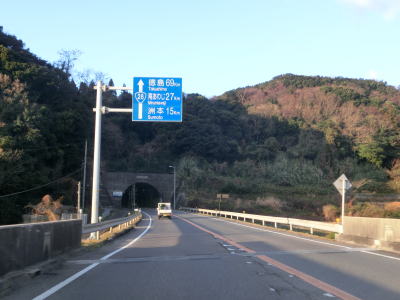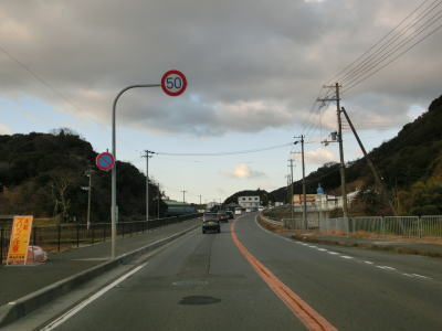 | 信号機のない兵庫r468との交差点を通過する。r468には安呼という内陸の近い場所の地名が案内されているが、r468自体は淡路島を横断する県道である。西海岸の地名が案内されていない事からも分かるとおり、狭路区間があり横断道路としての実用性は低い。 砂浜のある厚浜集落を通り過ぎると家屋が途切れて再び海沿いの異常気象時通行規制に入る。市境区間と同じ連続雨量160mm超で通行止になる。どちらの異常気象時通行規制区間も二桁国道とあって対面2車線で、安全速度は30km/hに設定されているが、そこまで線形は悪くなく、決して走りにくい道路状況ではない。 |