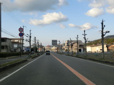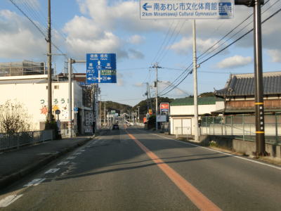 | 対面2車線道路を走っていると南あわじ市の中心部の南で兵庫r535円行寺交差点を通過する。その手前の円行寺橋が工事中だったが、多少車線幅を狭くしても2車線確保されており交互通行規制は敷かれていなかった。その後も2車線道路が続いており沿線の建物は途切れる事なく続いており、交通量もそれなりに多い。國衙東交差点の直後に1.0車線の道路との交差点があるが、その1.0車線幅の道路は兵庫r66で、國衙東交差点で交差しているのは市道である。市道も決して広い道路ではないが信号機が設置されている一方でr66との交差点には設置されておらずソトバがなければ県道が交差しているようには見えない。 | ||