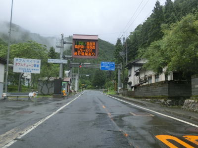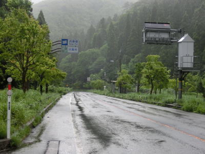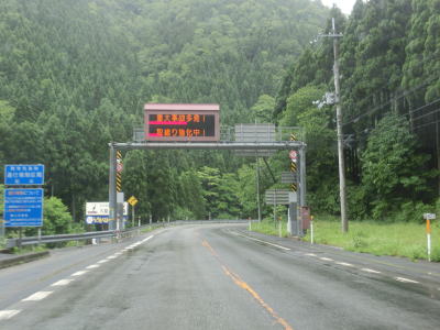 | 岩屋堂トンネルを出てからも集落が続いており、その前を走っているR29も快走路が続いている。八東川の両岸に広がっている小船集落には雨量通行規制区間を示す2つ目の標識と電光掲示板が設置されている。電光掲示板を通過して右カーブを曲がると登坂車線が現れる。登坂車線があるのは500m程度の距離である。 | ||