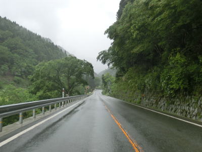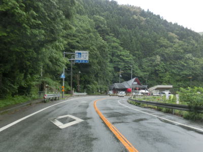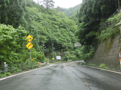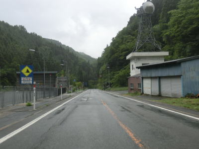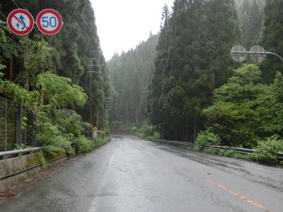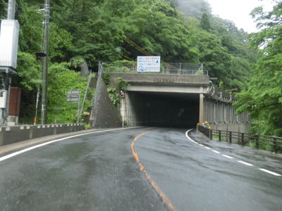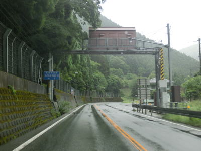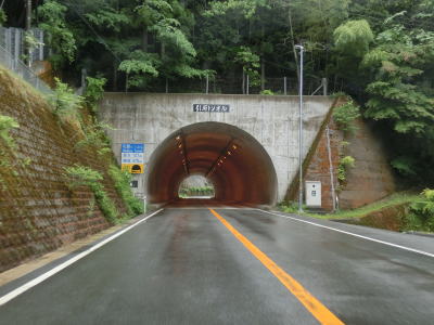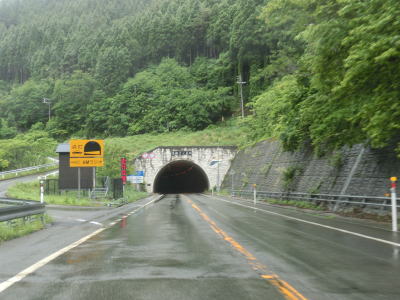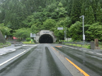 | 八東川に沿って走っていると岩屋堂集落を通過し、集落内に鳥取r72との交差点がある。r72は兵庫県との県境の江浪峠の前後が分断されている。岩屋堂集落を通り過ぎると雨量通行規制を示す標識を通過する。それによると連続雨量が、姫路側は160mmで、鳥取側は200mmで通行止になるとの事。県境を境に規制値が異なる理由は知らない。標識の先の右カーブを曲がると岩屋堂トンネルをくぐる。川に沿った旧道はフェンスが張られており通過できない。 | ||