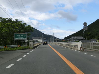 | 集落が途切れて揖保川と山に挟まれた状態を走っていると旧山崎町に入る。波賀・一宮町境標識と同様にこちらも平成の大合併以前のものがそのまま残っているようだ。旧山崎町に入ってすぐに集落が現れる。その後一旦集落が途切れるがすぐに次の集落に入り、右にカーブしてから井ヶ瀬橋で揖保川を渡って右岸に移る。平坦かつ直線的な2車線道路で集落を通り抜けると揖保川沿いを走る。 | ||