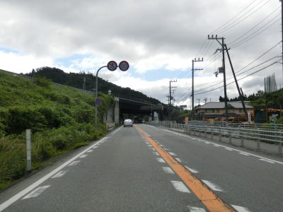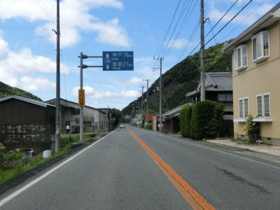 | 兵庫r519交差点を通過してから大きく左にカーブして林田川を渡り、「手延べそうめん ひやむぎ 揖保乃糸」と書かれた建物の前を右に大きくカーブする。揖保の糸というそうめんはおそらく関西人には馴染み深いものであろう。右カーブから程なくして兵庫r435林田交差点を通過する。さらに少し走ると左にカーブすると同時に上り勾配となるが、そこで市境を通過してたつの市に入る。市境の上を走っていると名もなき峠を越えて緩やかな勾配を下り、平坦になった所で左にカーブしながら兵庫r724追分交差点を通過する。 | ||
