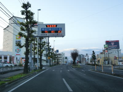 | 捨町交差点の上を通過して跨道橋の下りに転ずる所で右側車線が減少してしまう。しかし、平面道路になると拾町交差点からの平面道路が合流して再び片側2車線道路に戻る。平面道路に戻ってすぐの地点にも柳谷と美川、三坂の気象情報を示す電光掲示板が設置されている。交通量の多い片側2車線道路を南下していると上下線に高低差が生じる。おそらく元々はどちらかの車線が対面通行であり、車線を増やす際にこのような形になったのだろう。 | ||