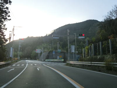 | 左のヘアピンカーブを曲がると登坂車線が現れる。二桁幹線国道との重複区間とあって登坂車線は1.2kmに達している。登坂車線が終わった先で塩ヶ森トンネルをくぐる。トンネルの中ほどに市町境があり、再び松山市に入る。 | ||