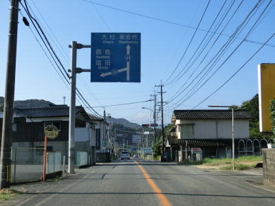 | 大三根橋を渡って直線道路を走り、緩やかな勾配を上った先でR205江頭交差点/E34長崎道・東そのぎICに至る。R205はこの交差点が起点であり、大村湾の北岸を通って佐世保市に至る。左折方向は東そのぎICである。 | ||