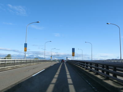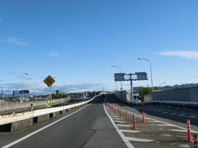 | 早朝にもかかわらず交通量の多い片側3車線道路を北上していると緩やかな勾配を上った後に矢田川と庄内川に架かる新川中橋を渡る。この橋の上だけ名古屋高速が東に逸れている。また、橋の南詰には愛知r202が交差しているが、交差点内にも中央分離帯があるため、各方向の右折及びr202の直進は不可能である。北詰の愛知r162新川中橋北交差点は信号機が設置されており、全ての方向の行き来が可能である。 | ||