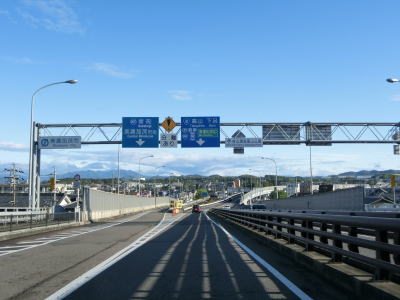| 対面2車線の高架橋を走っていると岐阜r207(R21・R41旧道)との太田本町4交差点だけでなく複数の市道の上を通過し、JR高山本線・長良川鉄道を越えてから勾配を下って平面道路に戻る。平面に戻った直後に側道が合流し、R21・R248太田町交差点を通過する。左折の岐阜方面、右折の土岐方面のどちらもR21・R248重複区間であり、案内標識には4つのおにぎりが串刺しになっている。 | ||