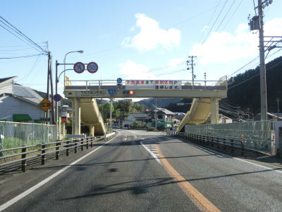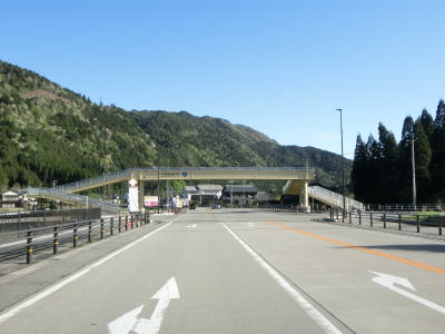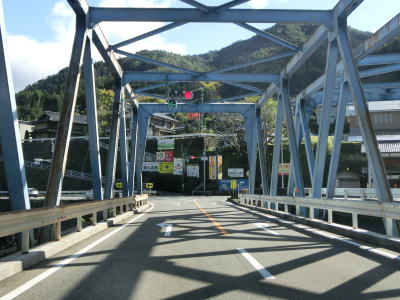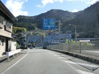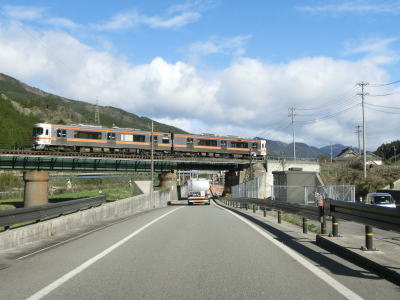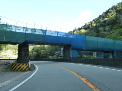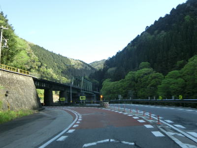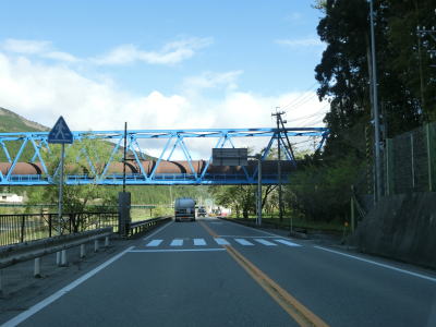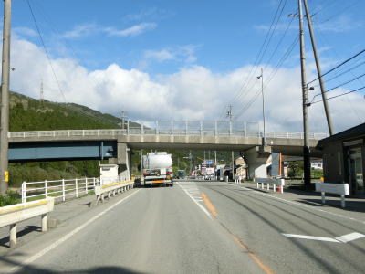 | JR高山本線の第三益田川橋梁と第四益田川橋梁の下を相次いでくぐる。第三益田川橋梁には制限高が設けられているが、白川町にあった第一飛騨川橋梁の4.2mよりも高い4.4mである。第四益田川橋梁をくぐってすぐに右の急カーブを曲がるが、車線の逸脱を防止するためと思われる中央分離帯が設置されている。 | ||