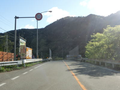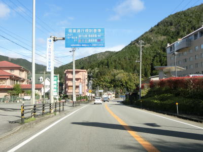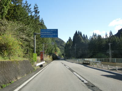 | 旧道との交差点以降も走りやすい2車線道路が続いている。沿線の家屋が途切れる所で雨量通行規制区間に入る。対象の区間は下呂市三原までで、白川町坂ノ東〜下呂市金山町金山と同様に連続雨量150mm超、時間雨量100mm超で通行止になる。雨量規制区間は「中山七里」と呼ばれる奇岩・怪石のある渓谷である。七里という名称が示す通り、その距離は27km程度ある。 | ||
