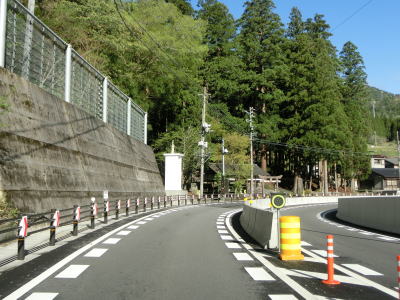 | 釣鐘集落付近で右、左とやや急なカーブが連続している場所を通過する。カーブ区間が終わると釣鐘洞門をくぐり、飛騨川に沿って右カーブを曲がる。2車線道路を走っていると右の急カーブを曲がった直後に七里橋を渡る。飛騨川の左岸を少し走るとJR高山本線の釣鐘トンネルの坑口付近の上を通過し、三原大橋を渡って右岸に戻る。 | ||