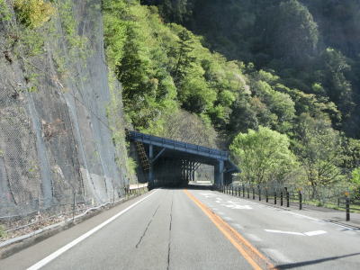 | 飛騨川の右岸を走っているとやや急な左カーブを曲がった後に門原洞門をくぐる。川の対岸にはJR高山本線が並走しており、R41とともに車窓から中山七里の風景を眺める事ができる。 | ||