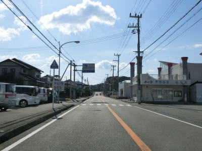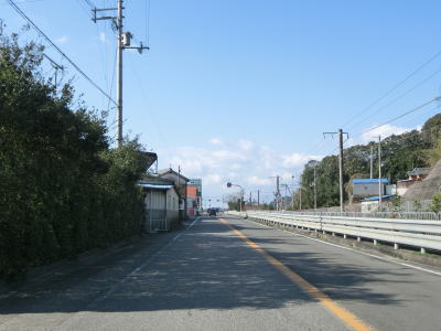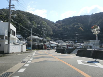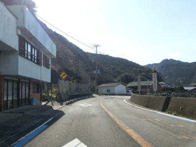| 道の駅の1km手前からは前方に複数のリゾートマンションが見えてくる。左にカーブしながら勾配を下ると朝来帰集落を通り抜ける。漁港に面した集落で海抜は5.4mと決して低くはないが津波注意区間となっている。 | ||
