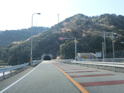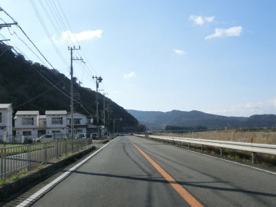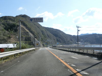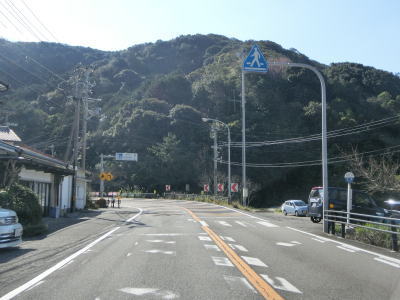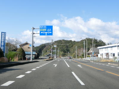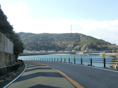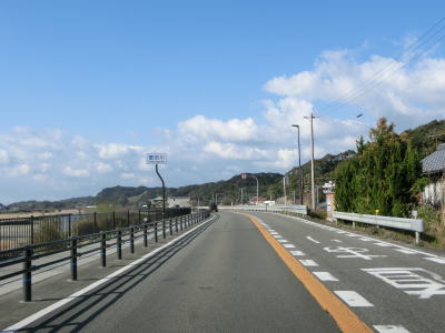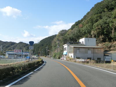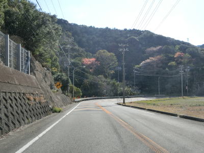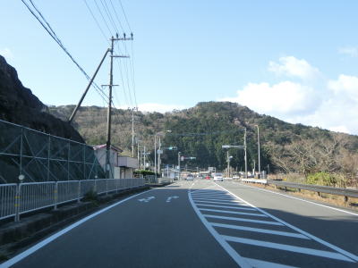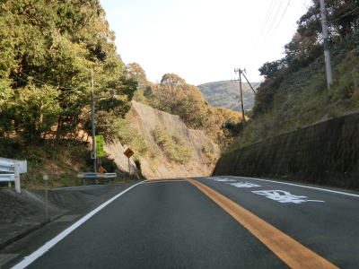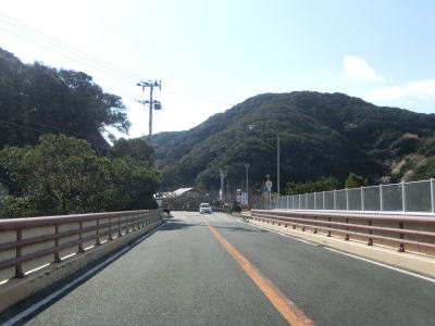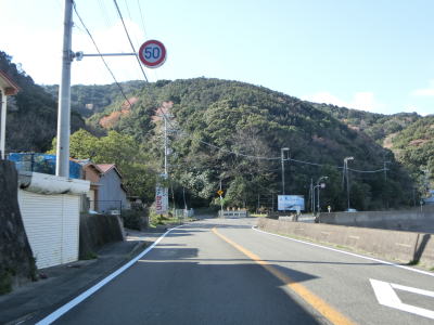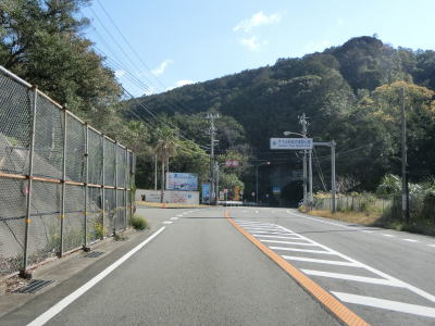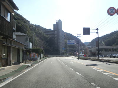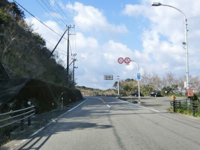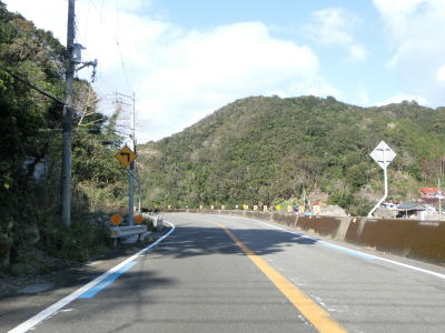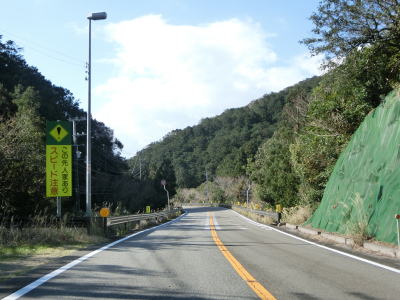 | 朝来帰集落を通り過ぎて緩やかな勾配を上っていると椿大橋を渡り、そのすぐ先で道の駅「椿はなの湯」の前を通過する。前述のリゾートマンションは道の駅の手前にある。道の駅を過ぎてからは海岸線から離れて内陸に進む。勾配は緩やかだがカーブが多い区間である。 | ||