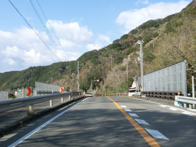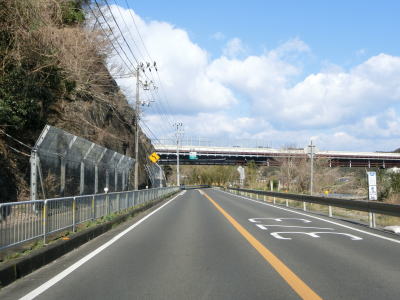 | 平坦な直線道路を走っていると高瀬川橋を渡り、そのすぐ先で一目坂隧道をくぐる。トンネルの手前から白浜町志原までの11.5kmは異常気象時通行規制区間に指定されており、連続雨量250mmを超えると通行止になる。一目坂隧道を出ると右の急カーブを曲がり、JR紀勢本線をオーバーパスすると左カーブを曲がって緩やかな勾配を下る。 | ||