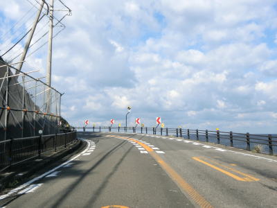 | カーブとアップダウンを繰り返す海沿いの2車線道路を走る。急なカーブもあるがセンターライン付きの2車線道路で交通量も多くないためさほど走りにくさは感じない。沿線にはテレホンパーキングの他にも車を停められるスペースが存在しているが、夏季には多くの車が停まっているものと思われる。 | ||