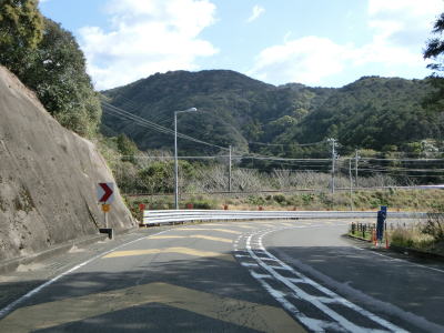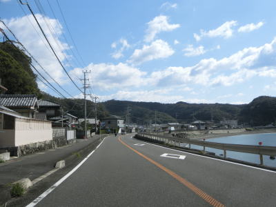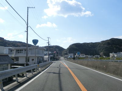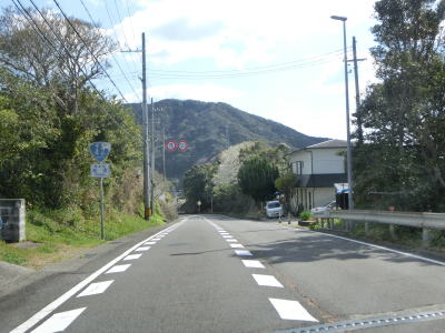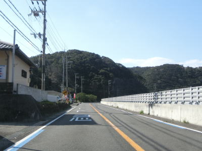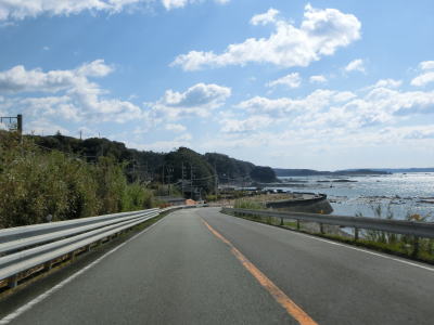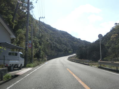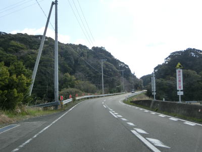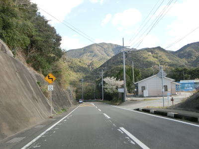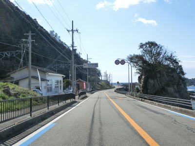 | カーブは多いが緩やかなものが多いので概ね走りやすい道路状況が続いている。標高は10m未満の場所を走っているため津波に注意を促す標識が設置されている。新宮市まで56kmと近付いてはいるが、まだ50km以上もあるのかという印象である。それに加えて串本町の隣接する那智勝浦町までも40km以上ある。 | ||