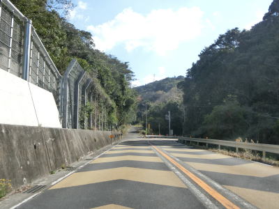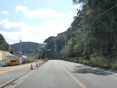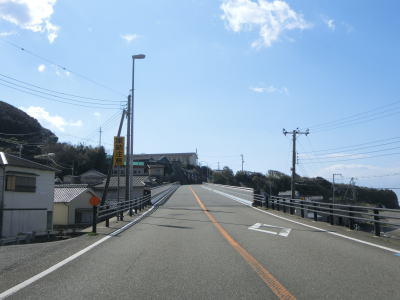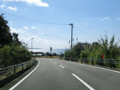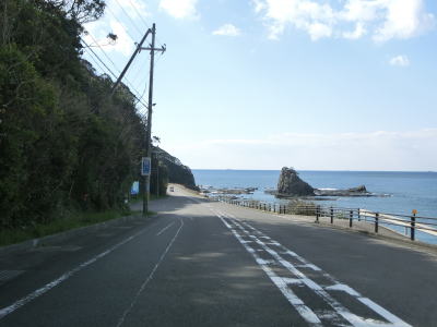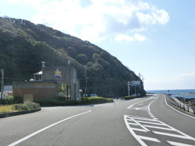 | 平松交差点から約7.1kmで道の駅「イノブータンランド・すさみ」を通過する。駐車台数は15台(乗用車+大型車)とかなり小規模な道の駅であり、東に別の道の駅「すさみ」ができてからは駐車場とトイレ、観光案内のみとなっている。道の駅を通り過ぎて少し走ると海から離れて緩やかな勾配を上っていると黒島隧道をくぐる。トンネルを出ると再び海沿いを走っているが、標高は2,30mとやや高い位置を走っている。夫婦波が見られる恋人岬を左カーブで通過する。 | ||