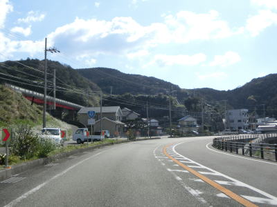 | JR紀勢本線と海の間を走っていると見老津集落で紀勢本線は内陸に、R42は引き続き海沿いを走る。見老津集落で見老津高架橋を通過し、集落を過ぎてからも上り勾配が続いている。 | ||