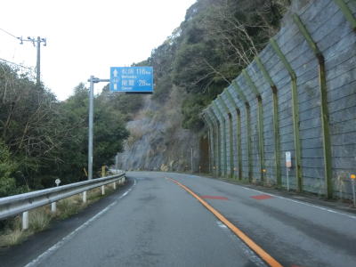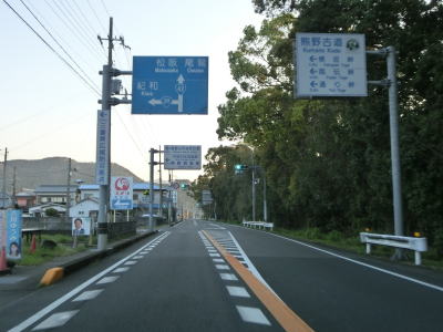 | JR紀勢本線と海の間を快走しているとR311立石南交差点を通過する。R42は多くの国道の起点もしくは終点となっているが、この立石南交差点はR311の起点でもなければ終点でもなく、尾鷲方面に重複している。なお、岩崎交差点〜立石南交差点の距離はR42の約127kmに対してR311は約93kmと30km以上短い。田辺市〜熊野市の往来だけでなく、R168(R169重複)を利用すれば田辺市〜新宮市の往来もR42よりもR311を走った方がより早く着ける可能性がある。 | ||