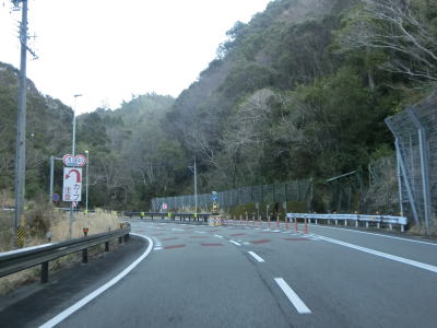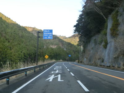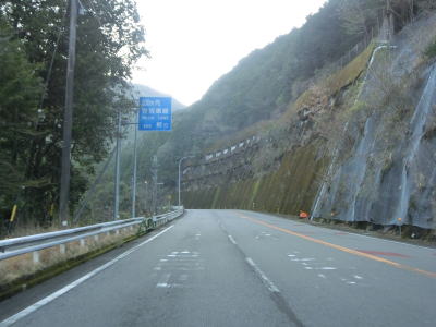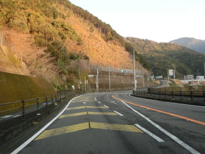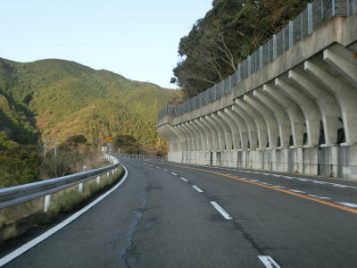 | 熊野大泊ICからも上り勾配が続いており、熊野宮川を長大な清滝大橋で渡ると異常気象時通行規制区間に入る。小阪トンネルを含む5.5kmの区間が連続雨量300mm超で通行止となる。熊野古道のひとつである観音道の出入口を通過した後に清滝の近くで左カーブを曲がる。 | ||