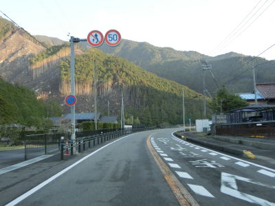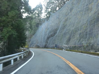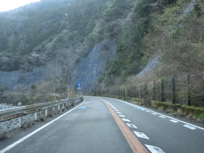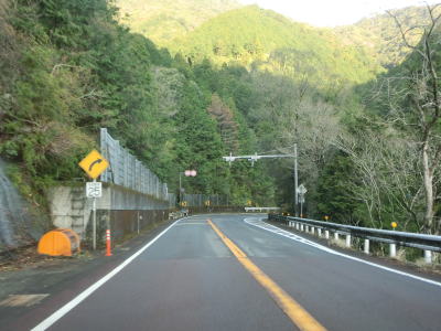 | 池田平集落と大久保平集落の間の家屋が途切れた場所では歩道に複数の大きな落石があったのを確認できた。石は撤去されておらずその上から落石防止ネットを張られたような感じであった。熊野市側の最後の集落の大久保平集落を過ぎると異常気象時通行規制区間に入る。市境を挟むこの区間は連続雨量300mm超もしくは換算連続雨量280mm超で通行止になる。 | ||