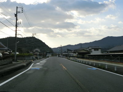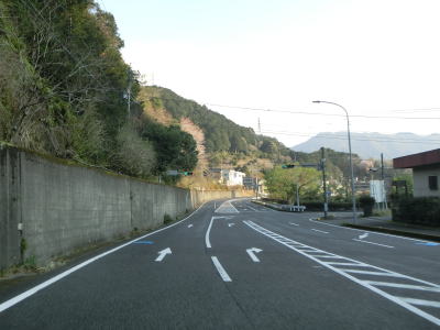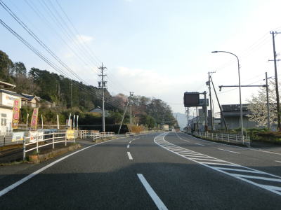 | 道瀬トンネルを出た直後にJR紀勢本線のトンネルの上を通過し、線路と並走しながら緩やかな勾配を下る。左カーブを走っていると町道との古里交差点を通過する。道路の右側には多くの家屋が建っているが、左側は山なので家屋はほとんどない。 | ||