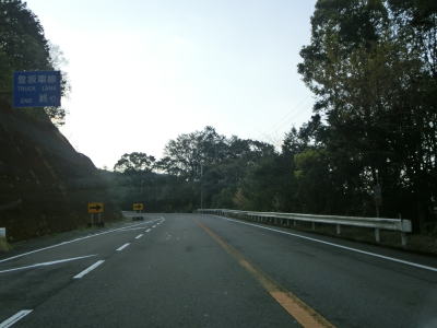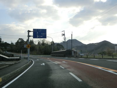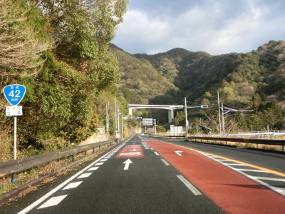 | 坂場交差点からは上り勾配となり、約200m進んだ所で左側車線が登坂車線になる。勾配はそれほど急ではないがカーブが多い。紀勢道が並走しており、かつ無料で通行できる区間のためR42の交通量は少ない。約1.1km走ると登坂車線が終わる。 | ||