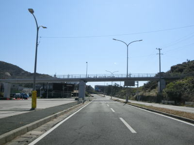 | 勾配が緩やかであるが故に登坂車線は設置されていないが、遅い車や農耕車のための待避所がいくつか設けられている。もっとも、大型車どころか乗用車の幅よりも狭いものもあるので利用しやすい設備とは言えない。押しボタン式の信号機の東に交差している道路があるが、これは愛知r497である。r497のこれより東の区間は未整備である。 豊川用水東部幹線水路を西七根橋で渡り、右カーブを曲がっていると愛知r406東七根交差点を通過する。案内標識の支柱に道の駅「とよはし」の標識が設置されているが、ピクトグラムと左折矢印がシールで隠されている。R23とr406との七根ICの北に隣接している道の駅は走行日時点ではオープン前である(2019年5月26日にオープン)。 |