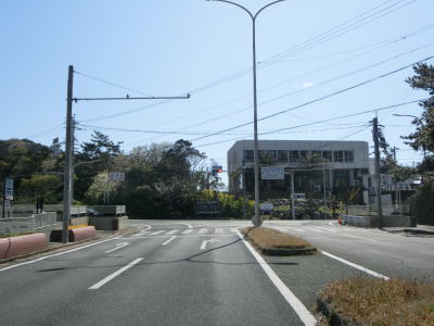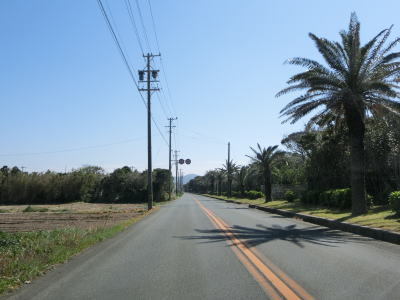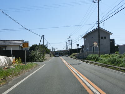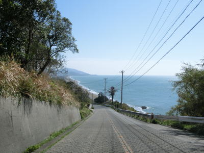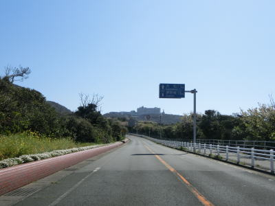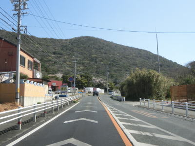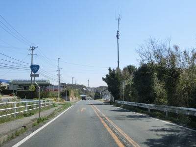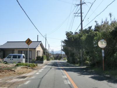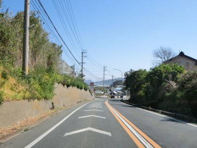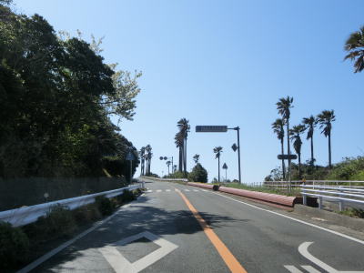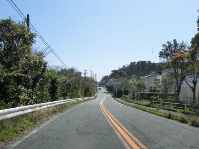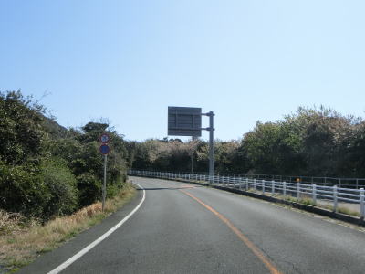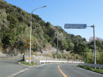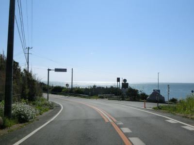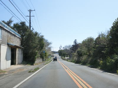 | 伊良湖港入口交差点の直後に左急カーブを曲がり、海沿いを走るようになる。海岸線との距離は100〜200mで標高が20m超と少し高いのだが、海側に樹木があるため海が見える場所は多くない。アップダウンしている2車線道路を走っていると右カーブを曲がる。 | ||