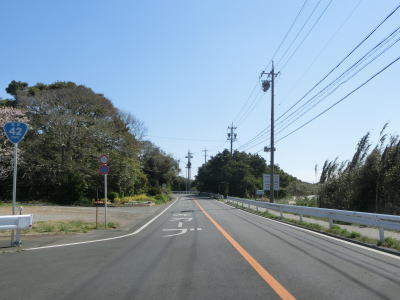 | 右カーブを曲がった直後に愛知r497との交差点を通過する。r497は田原豊橋自転車道線という路線名で渥美サイクリングロードと呼ばれている。道の駅の東から伊良湖岬を回り込んでいるようだが、その区間はウォッちずでは県道色に塗られていない。r497との交差点を通過してからは歩道がなくなるので伊良湖港入口交差点以降の歩道はr497なのかもしれない。 r497交差点からも海沿いの少し高い場所を走っている点に変化はないが、海が良く見えるようになる。左の急カーブを曲がった先で簡易パーキングを通過するが、その下にはr497がアンダーパスしている。駐車場の北端から延びている道路に進めばr497に行く事ができる。 |
