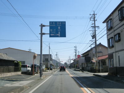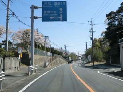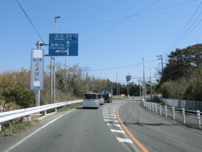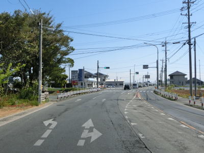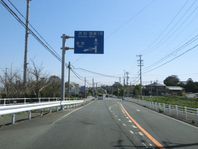 | 沿線の家屋が途切れる事なく続いている2車線道路を淡々と走る。勾配はほとんどないが若干カーブが多くなる。と言っても緩やかなものばかりなので走りやすい道路状況と言える。右カーブを曲がっていると愛知r28高松一色交差点を通過する。交差点の直後に浜松までとR1までの距離が表記された案内標識があるが、R42は浜松市役所より手前にあり、またR1との重複区間もあるため、浜松市より近くR1よりも遠い位置に起点がある。 | ||